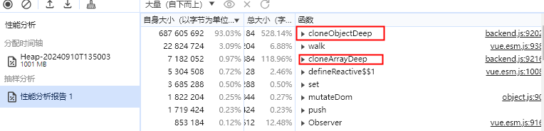 从函数名称和源代码定位中可以发现,这两个函数位于 Vue devtools 源代码中,并且它们的作用是对对象和数组进行深拷贝。我们知道,深拷贝会完整深度复制对象的所有属性,对内存的影响非常大,因此这很可能是造成这次内存泄漏的关键原因之一。